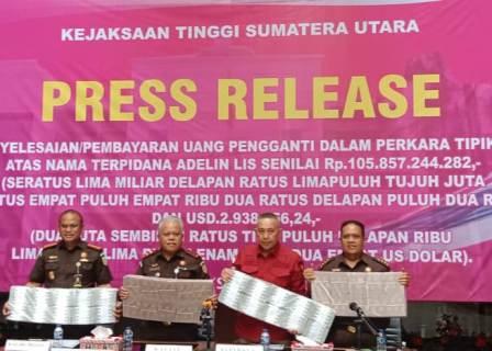 Kejaksaan Tinggi Sumatera Utara (Kejati Sumut) menerima uang pengganti kerugian negara dari terpidana Pembalakan Liar, Adelin Lis senilai Rp105 miliar dan US$ 2,9 juta lebih.
